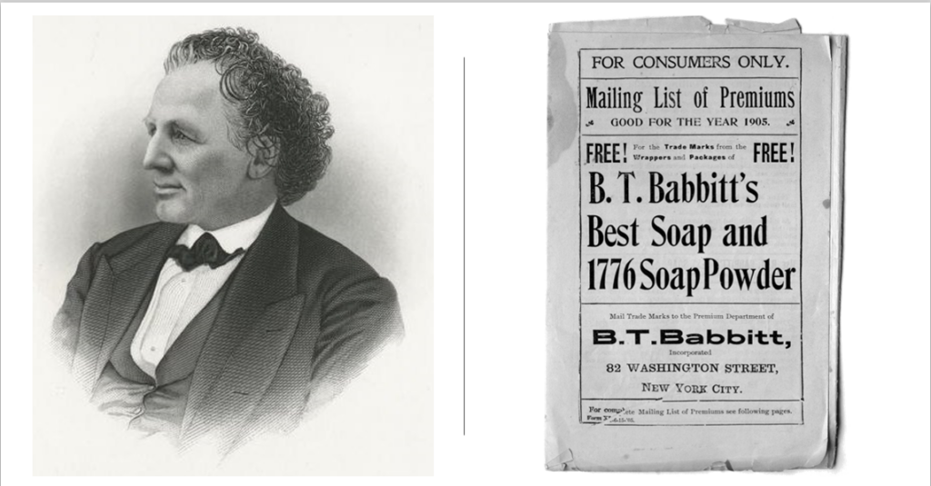 Babbitt was a New York business owner whose company was the first to manufacture and market soap in individual bars. “Babbitt’s Best Soap” could be found in most homes at the time, attributable to his pioneering use of national advertising to promote his brand. The product’s ad slogan: “Full of hope with Babbitt’s soap”.