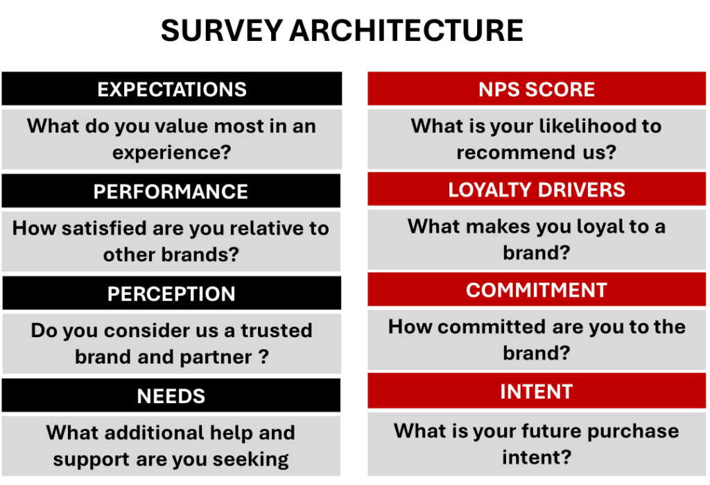 The survey architecture is critical. What you want to understand is the gap between the expectations of customers and how satisfied they are with their actual experience. You need to determine the relative importance to them of various facets of that experience. You also want to know how they perceive your brand versus the competition. And you should know whether there any important underserved needs you may not be aware of. But most importantly, you need to assess their level of loyalty, using both NPS as a measure of advocacy and a “commitment” score as a measure of loyalty.