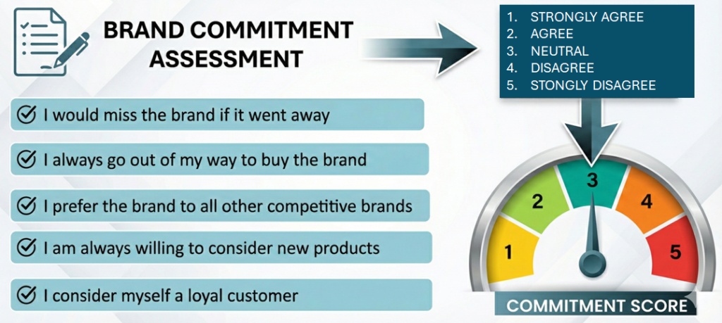 The commitment score is a composite metric made of weighted ratings on a 5 or 7-point Likert scale based on customer responses to a set of five questions: 1) Would they miss the brand if it went away?; 2) Would they go out of their way to buy the brand?; 3) Do they prefer the brand to all other brands?; 4) Are they always willing to consider new products?; 5) Do they consider themselves a loyal customer?