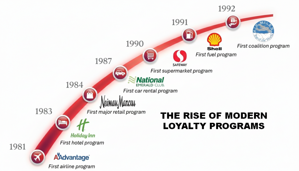 The advent of modern-day loyalty programs began with airlines in 1981 and rapidly migrated to other industries through the 1980s and early 90s due to their popularity with customers.
